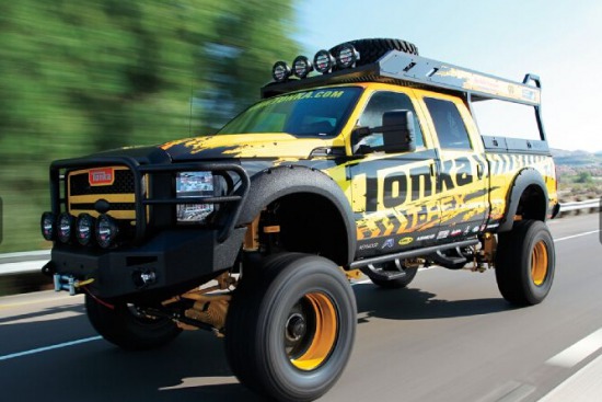 眼前這輛Tonka版福特皮卡正式為這些長大了的男孩子準備的最好的玩具,這輛2013款福特F-250SuperDuty首先換上了Kelderman出品的8-10英寸空氣懸掛套件獲得一個高大威猛的基礎,Accuair控制系統(tǒng)能夠在車內對懸掛系統(tǒng)輕松操作。Tonka品牌的經(jīng)典黃色涂裝也成為這輛車的主題色,懸掛組件和AmericanForce輪圈也一并采用了黃色涂裝,輪胎選擇了ToyoOpenCountryM/T。