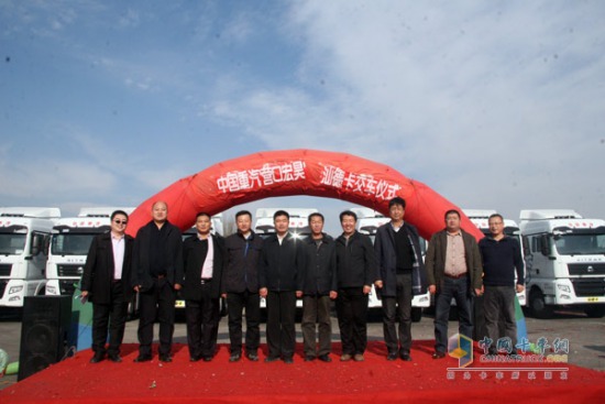 2014年11月26日,時隔一年,中國重汽汕德卡(SITRAK)高端重卡再次來到美麗的營口鲅魚圈,營口宏昊物流經(jīng)過首批2輛汕德卡(SITRAK)適用后,追加28輛累計(jì)訂購30輛汕德卡(SITRAK),此次10輛汕德卡(SITRAK)成功交付營口宏昊物流。中國重汽濟(jì)南商用車銷售部總經(jīng)理劉正濤、營口宏昊物流總經(jīng)理趙克臣、營口物流協(xié)會會長魯田良,遼寧鑫鼎實(shí)業(yè)董事長唐純等共同見證了此次交車活動。